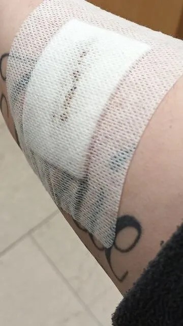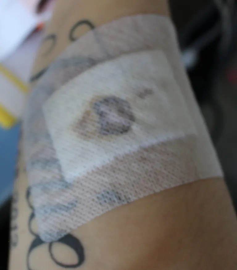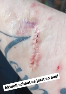 Paar Tage danach musste ich wieder hin, zum Verband wechseln. Also das Pflaster. War schon sehr gespannt, wie es aussieht. Weil ich durch das Pflaster gesehen hab auf der Seite, dass ich Blau bin.